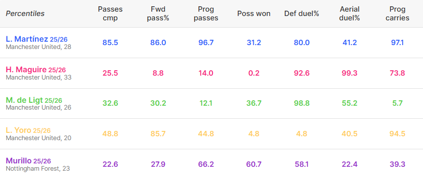 Martinez (Blue), Maguire (Pink), De Ligt (Green), Yoro (Yellow) and Murillo (Purple).
